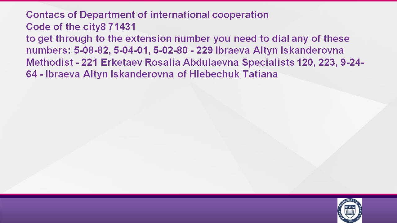 Call-center: 8(71431)50702, 87013849448 По вопросам заселения в общежития: 8(71431)9-25-68, 87054403859 Электронный адрес: abiturient@rii.kz