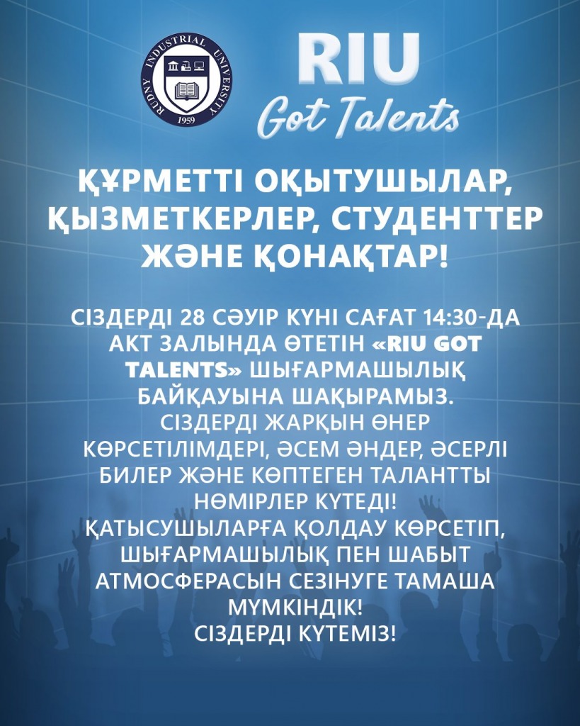 Сіздерді 28 сәуір күні сағат 14:30-да акт залында өтетін «RIU Got Talents» шығармашылық байқауына шақырамыз.
