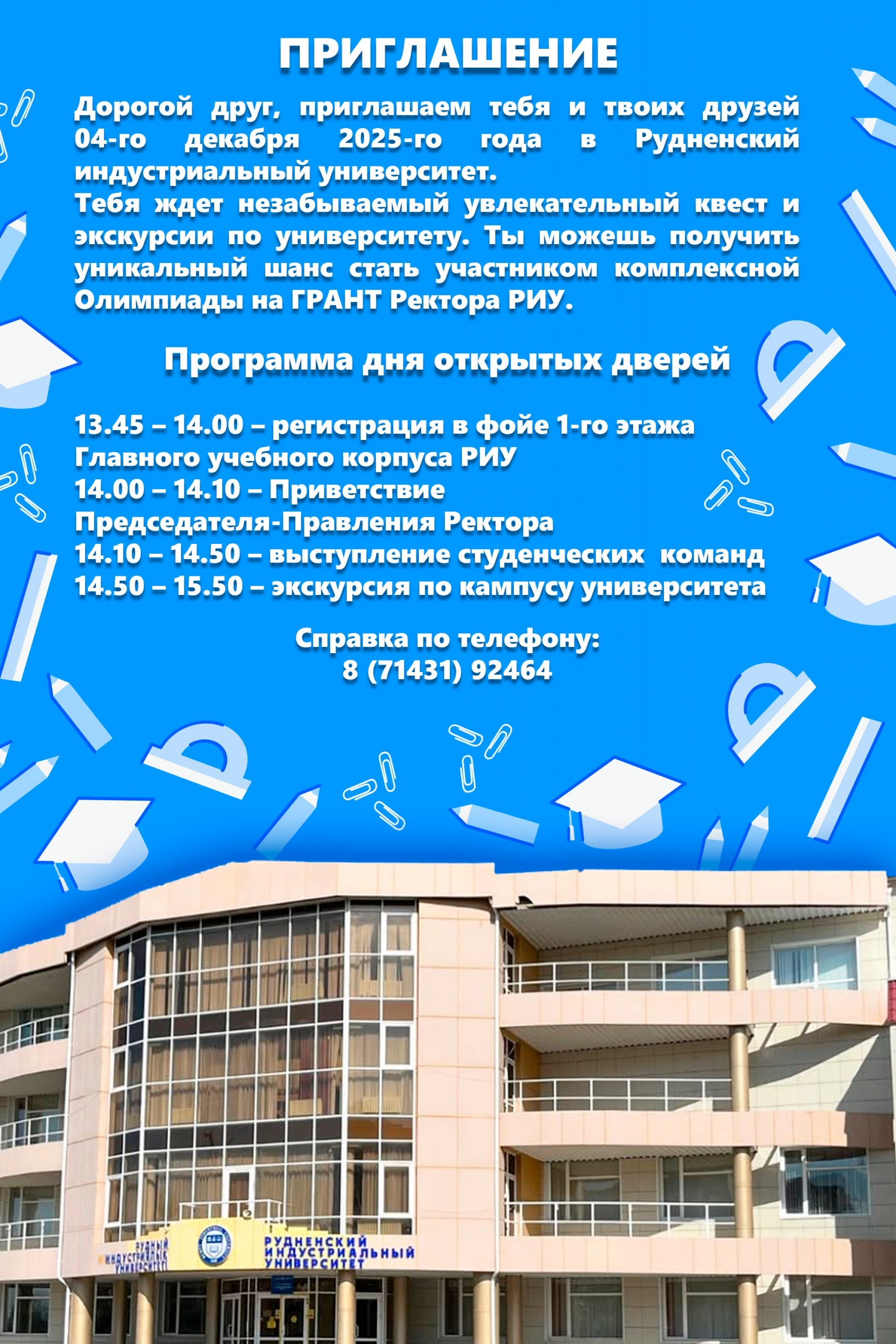 Дорогой друг, приглашаем тебя и твоих друзей 4 декабря 2025г. в Рудненский индустриальный университет. Опубликовано 03.12.202503.12.2025 автором Зайдат Мухамеджанова Мы в социальных сетях: